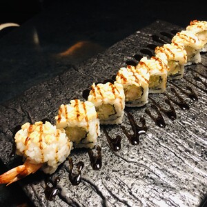 zucca in tempura, avocado e goma wakame.8 PZPumpkin tempura, avocado and goma wakame. 8 PCS
